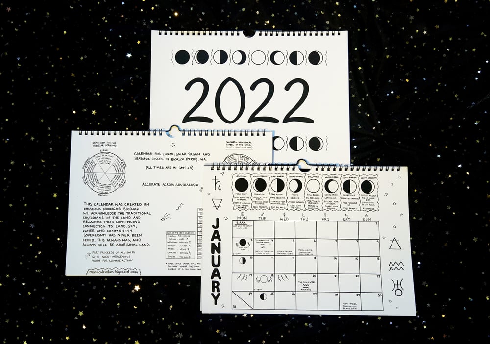 Includes moon phases with guidance, sun transits through the zodiac signs, Noongar seasons, pagan sabbat dates, lunar and solar eclipses, and visible meteor showers for 2021.